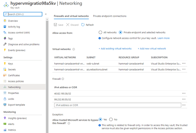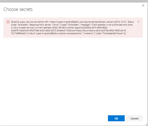 Sample text for query purposes “Failed to query service connection API: ‘https://hypervmigratio98a5kv.vault.azure.net/secrets?api-version=2016-10-01’. Status Code: ‘Forbidden’, Response from server: ‘{“error”:{“code”:”Forbidden”,”message”:”Client address is not authorized and caller is not a trusted service.\r\nClient address: 40.82.190.38\r\nCaller: appid=2c5a35cb-ef1f-4659-98a2-dca8761c0def;oid=f54370a6-bc53-4e02-8d73-63de4c317b54;iss=https://sts.windows.net/a1a2578a-8fd3-4595-bb18-7d17df8944b0/\r\nVault: hypervmigratio98a5kv;location=canadacentral”,”innererror”:{“code”:”ForbiddenByFirewall”}}}’