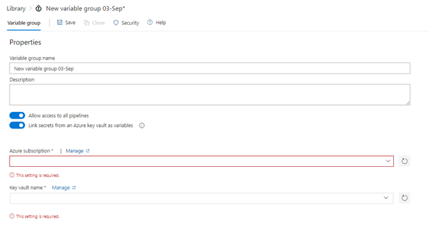 - After adding the key vault, you need to add all the variables you need from the Keyvault into the variable group.
