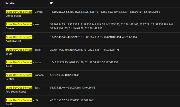 - Search for Azure DevOps services and add all the IPs listed there for your region. You can see in the screenshot below that for the Canadian region, the IP we saw in the message above is listed.