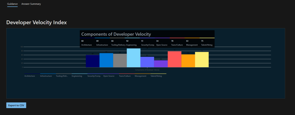 I have ran this assessment for multiple customers using it as a “Listen & Learn” tool to understand where my customers are from a DevOps maturity perspective. The report produced by the assessment gives you an overall score and it also breaks it down by “Components of Developer Velocity” such as Architecture, tooling and others.