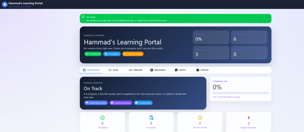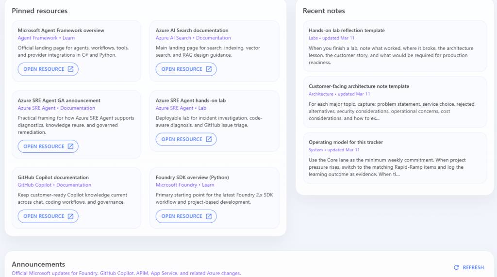 I wanted a single place where I could track what I was learning, what I needed to build next, which resources were worth coming back to, and what I had already figured out. So I built a Blazor-based workspace for myself. It includes a training plan, saved resources, notes, timeline views, and a private dashboard.